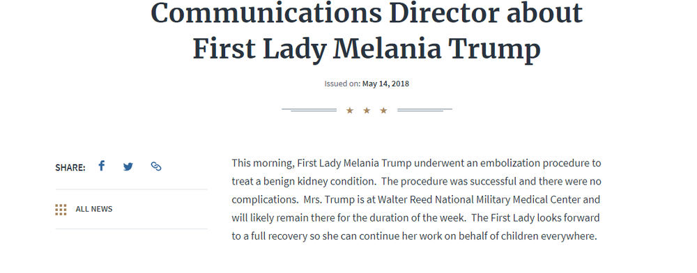 "Сегодня утром первая леди Меланья Трамп перенесла процедуру эмболизации на почках из-за доброкачественных новообразований. Процедура прошла успешно и без осложнений", - говорится в опубликованном сообщении.