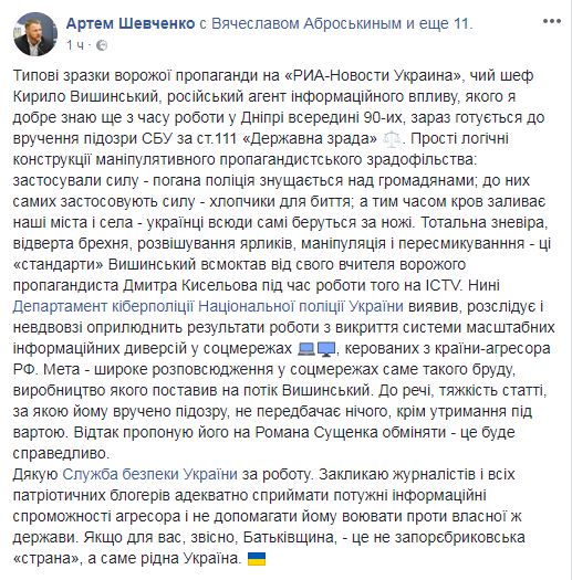 "Департамент киберполиции Национальной полиции Украины обнаружил, расследует и вскоре обнародует результаты работы по раскрытию системы масштабных информационных диверсий в соцсетях, управляемых из страны-агрессора РФ. Цель – широкое распространение в соцсетях именно такой грязи, производство которой поставил на поток Вышинский", – написал Шевченко.