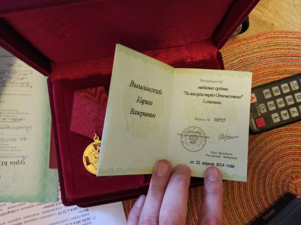 Также СБУ показала документы Вышинского, в том числе ксерокопию его украинского паспорта, деньги в долларах и рублях, а также награды, в том числе "За возвращение Крыма".