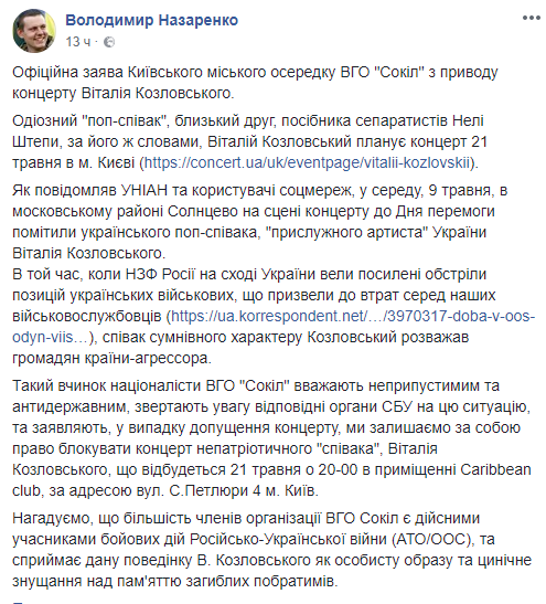 После того, как Виталий Козловский выступил в Москве на 9 мая, праворадикальная организация "Сокол" заявила о планах блокировать его концерт в Киеве 21 мая.