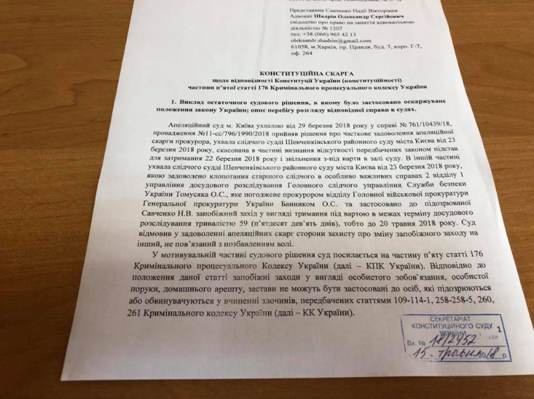 Подозреваемая в организации теракта депутат Надежда Савченко обратилась с жалобой в Конституционный Суд Украины.