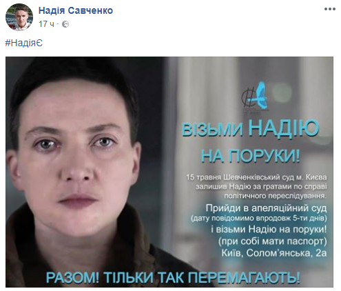 В соцсетях активно распространяется информация об акции под названием "Візьми Надію на Поруки!". Всех желающих приглашают прийти в Шевченковский суд Киева с паспортом и заявить о намерении взять на поруки подозреваемого в организации теракта и арестованного нардепа Надежду Савченко.