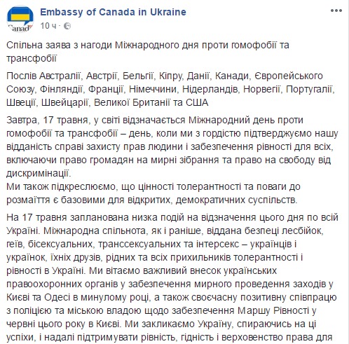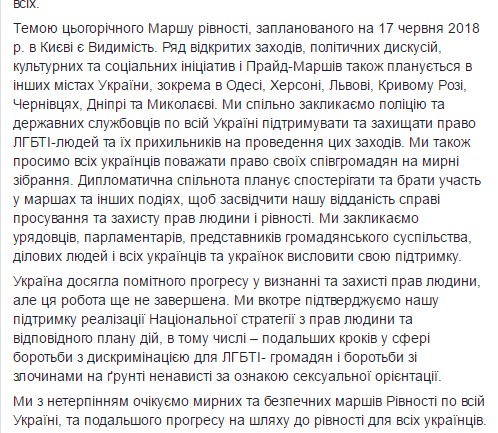 "Мы совместно призываем полицию и государственных служащих по всей Украине поддерживать и защищать право ЛГБТ-людей и их сторонников на проведение этих мероприятий. Мы также просим всех украинцев уважать право своих сограждан на мирные собрания", - сказано в заявлении послов.