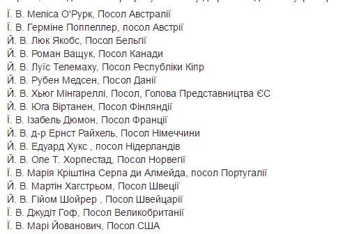 Совместное заявление подписали послы ЕС, Австралии, Австрии, Бельгии, Кипра, Дании, Канады, Финляндии, Франции, Германии, Нидерландов, Норвегии, Португалии, Швеции, Швейцарии, Великобритании и США.