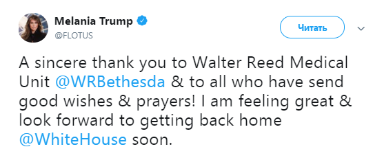 "Я чувствую себя прекрасно и с нетерпением жду возвращения домой в Белый дом в ближайшее время", - написала Мелания Трамп.