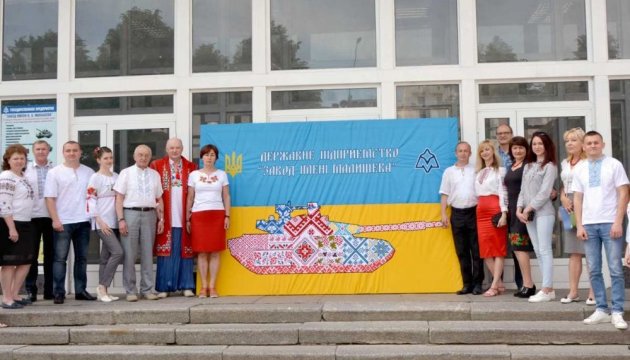 На ГП "Завод имени Малышева" (танковом заводе) в День вышиванки презентовали желто-голубой баннер с вышитым изображением танка "Оплот".