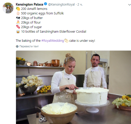 В состав свадебного торта вошли 200 лимонов, 500 органических яиц из Суффолка, 20 килограмм масла, муки и сахара, а также 10 бутылок сиропа из бузины - Elderflower Cordial.