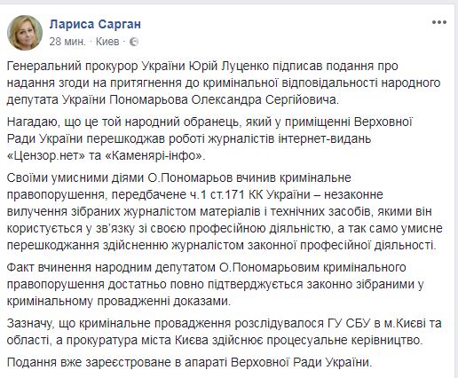 Генпрокурор Юрий Луценко подписал представление о предоставлении согласия Рады на привлечение к уголовной ответственности нардепа из группы "Воля народы" Александра Пономарева из-за препятствования работе журналистам.