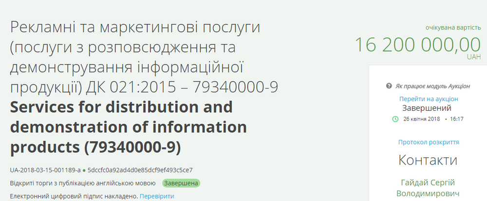 В мининформполитики готовы были потратить больше, ожидаемая стоимость закупки составила 16,2 млн грн.