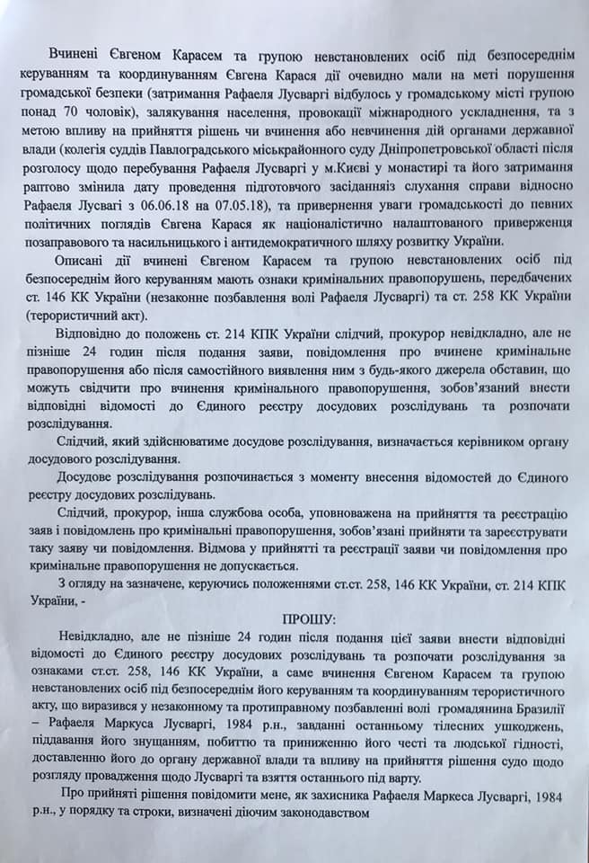 Согласно заявлению, группа националистов под руководством Карася избила и унизила честь и достоинство Лусварги, который находился на свободе на законных основаниях, настолько, что инцидент может стать причиной международного скандала между Украиной и Бразилией.