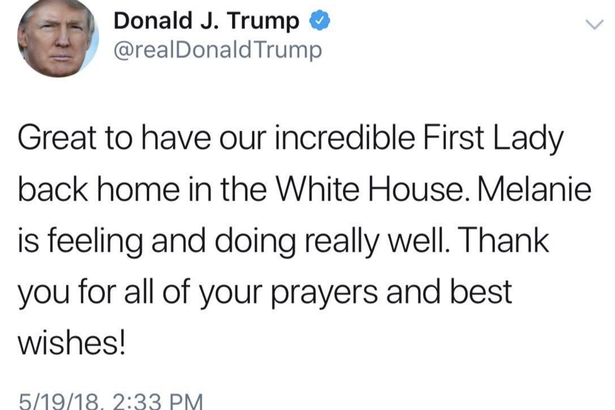 "Замечательно, что наша потрясающая первая леди вернулась домой в Белый дом. Мелани чувствует себя хорошо и идет на поправку", - отметил Трамп, написав изначально имя жены Melanie вместо Melania.