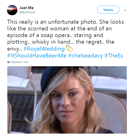 Среди приглашенных на свадьбу принца Гарри и Меган Маркл оказалась его бывшая девушка Челси Дэви. Пользователи Сети обратили внимание на выражение ее лица во время церемонии и тут же высмеяли его.