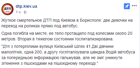 Рейсовый автобус "Чигирин-Киев", который ехал через Борисполь, сбил на переходе двух девочек, которые переезжали дорогу на роликовых коньках.