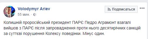 "Бывший пророссийский президент ПАСЕ Педро Аграмунт вообще вышел из ПАСЕ после введения против него десятилетних санкций за существенные нарушения кодекса поведения", - написал Арьев.