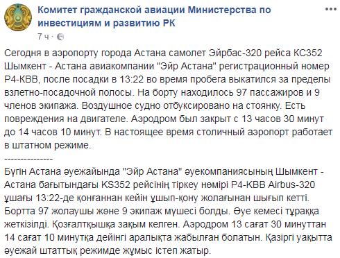 Об этом в Facebook сообщил комитет гражданской авиации Министерства по инвестициям и развитию Казахстана.