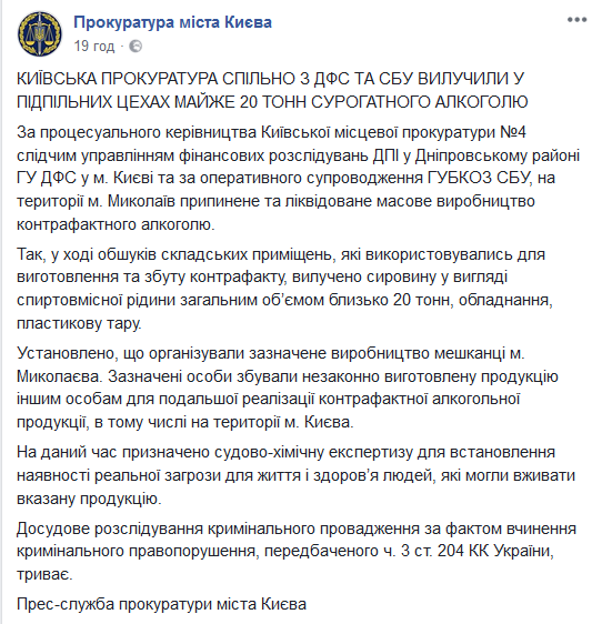 Досудебное расследование уголовного производства по факту совершения уголовного правонарушения, предусмотренного ч. 3 ст. 204 УК Украины, продолжается.