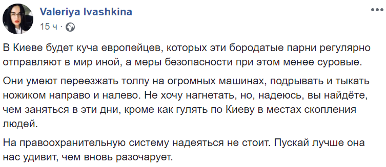 Они умеют переезжать толпу на огромных машинах, подрывать и тыкать ножиком направо и налево. Не хочу нагнетать, но, надеюсь, вы найдёте, чем заняться в эти дни, кроме как гулять по Киеву в местах скопления людей.