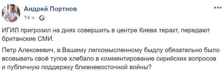 "ИГИЛ не понимают кому они угрожают терактом. Взрывом или очередной перестрелкой в центре Киева уже давно никого не удивишь. А если пострадает кто-то из политиков/чиновников, то они еще и на выборах свои 5-7% получить смогут".