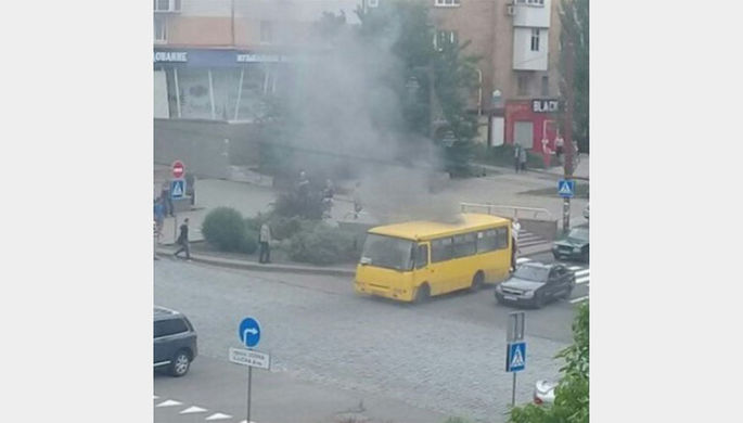 Очевидцы публикуют фотографии с места инцидента, на которых видно, что маршрутка остановилась на перекрестке и из ее салона через люк валит черный густой дым.