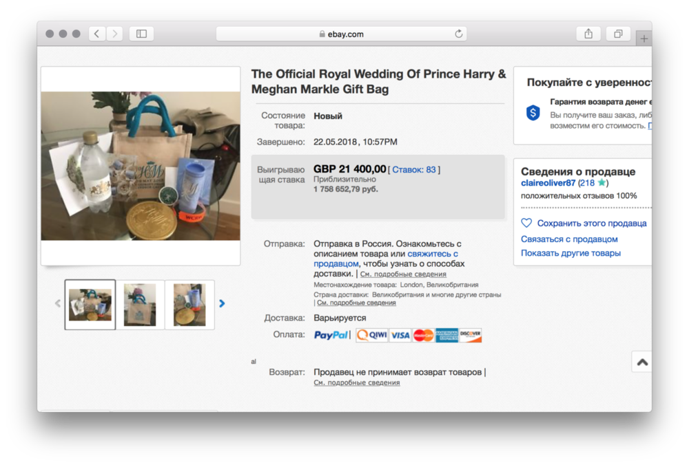 Оливер удалось продать сувениры за 21,400 фунтов (примерно 744 тысячи гривен). На аукционе было сделано 83 ставки. Женщина отказалась обсуждать свое решение и подчеркнула, что еще как минимум 25 гостей продают подарочные наборы с королевской свадьбы на Ebay.