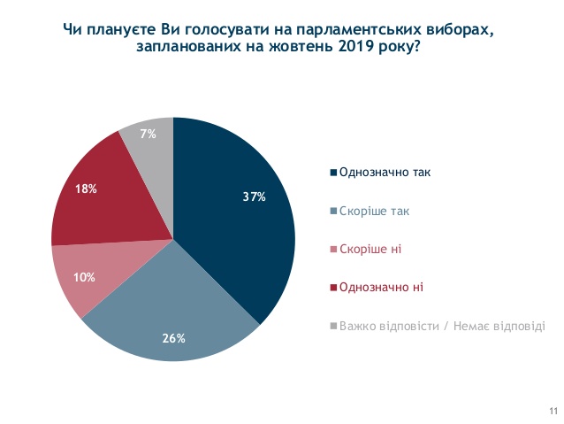 Однозначно уверены, что пойдут на парламентские выборы в октябре 2019 года только 37% опрошенных. Еще 26% говорят, что могут пойти. Но на этом оптимисты заканчиваются. 28% говорят, что не собираются на выборы и 7% - еще вообще не определились. Иными словами - вообще не думают о том, что надо идти и за кого-то голосовать.