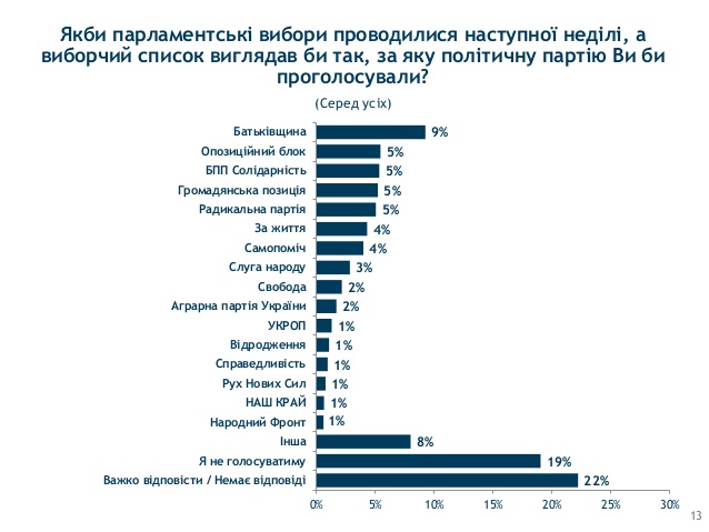 Традиционно на дне рейтинга плавает и никуда не проходит "Народный фронт", который пока еще контролирует ряд ключевых должностей в стране.