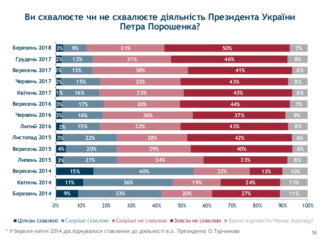 Так, Петру Порошенко в марте не доверяли более 80% процентов опрошенных, а доверяют - 13%. Это самый высокий показатель негатива за последние несколько месяцев.