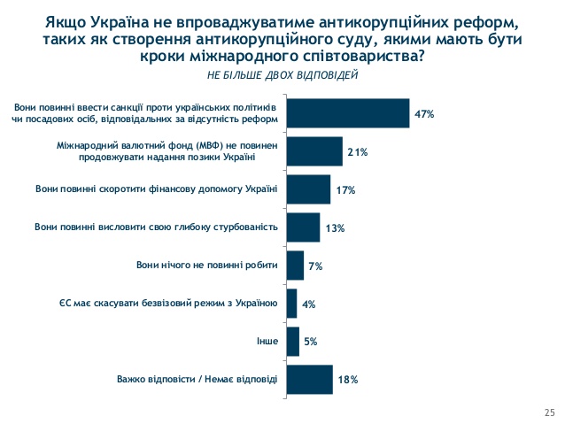 За санкции против украинских политиков выступили 47% респондентов, за остановку кредитования и финпомощи - суммарно 38%. При этом 4% хотят отмены безвизового режима.