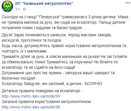 Днем среды, 23 мая ​​на станции киевского метро "Печерская" травмировался 5-летний мальчик. Его пальцы попали между ступенями и балюстрадой.