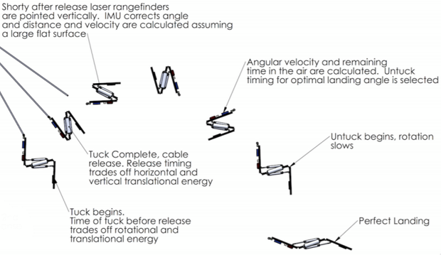 Перед выполнением переворота робот закрепляется на поднятом тросе. В конце падения он отцепляется от троса и прижимает крайние сегменты к центральному подобно тому, как люди прижимают к телу руки и ноги. За счет этого он ускоряет свое вращение и может совершать до двух обратных переворотов за один прыжок: