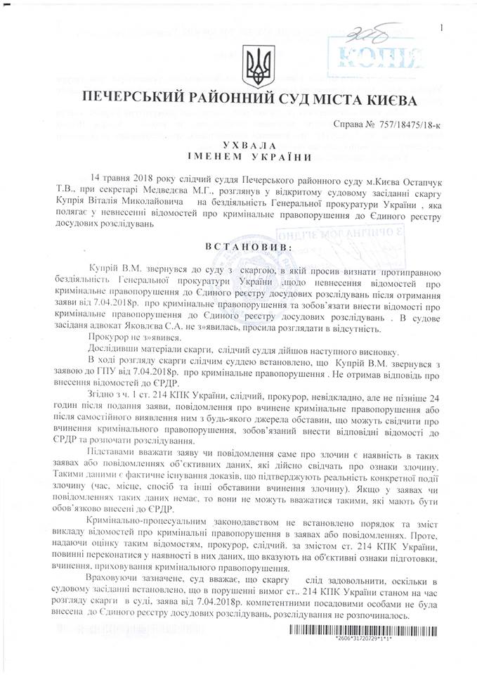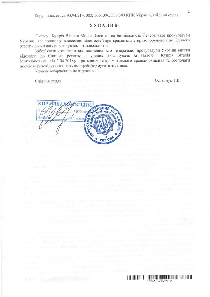 Об этом сообщил внефракционный нардеп Виталий Куприй на своей странице в Facebook и опубликовал соответствующее постановление суда.