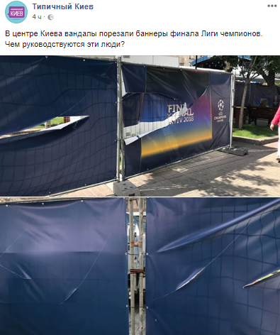 В Киеве вандалы порезали установленные на Крещатике к финальным матчам Лиги чемпионов УЕФА баннеры. Об этом сообщается на странице ресурса Типичный Киев в Facebook.