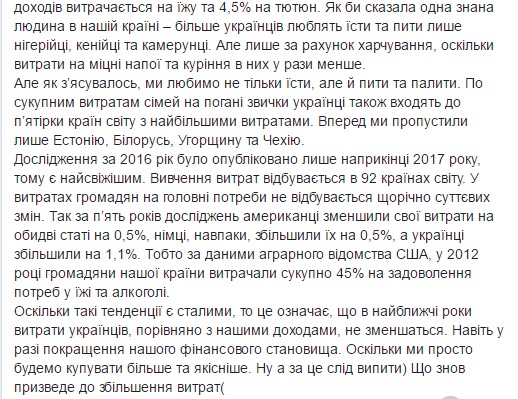 "Наши соседи поляки тратят на питание 16,5% и 6,2% пропивают. Китайцы проедают 22,5% и еще 2,3% платят за пагубные привычки. В Египте, к которому многие украинцы ездят отдыхать, 36,7% доходов тратится на еду и 4,5% на табак. Как сказал бы один известный человек в нашей стране – больше украинцев любят есть и пить только нигерийцы, кенийцы и камерунцы. Но только за счет питания, поскольку затраты на горячительные напитки и курение в них в разы меньше", - подчеркивает он.