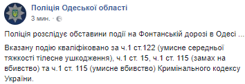 "Указанное событие квалифицировано по ч.1 ст.122 (умышленное средней тяжести телесное повреждение), ч.1 ст. 15, ч.1 ст. 115 (покушение на убийство) и ч.1 ст. 115 (умышленное убийство) Уголовного кодекса Украина", - говорится в сообщении.