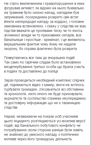 "Сейчас, несмотря на показания участников этого инцидента, рассматриваются все возможные версии событий, от банального бытового конфликта или ограбления (когда стороны ранее были даже не знакомы) до умышленного нападения по политическим мотивам за общественную деятельность", - пояснил он.