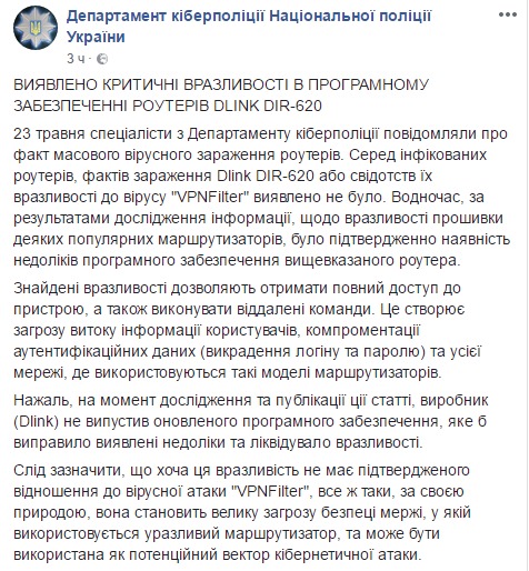 Специалисты из Департамента киберполиции Нацполиции Украины ранее сообщали о факте массового вирусного заражения роутеров и фактов заражения "Dlink DIR-620" или свидетельств их уязвимости к вирусу "VPNFilter" обнаружено не было, однако, по результатам исследования информации относительно уязвимости прошивки некоторых популярных маршрутизаторов, было подтверждено наличие недостатков программного обеспечения вышеуказанного роутера.