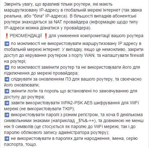 Также в Департаменте киберполиции опубликовали рекомендации для избежания компрометации роутеров: "по возможности не использовать маршрутизируемые IP-адреса в глобальной сети Интернет. В случае, если это невозможно,