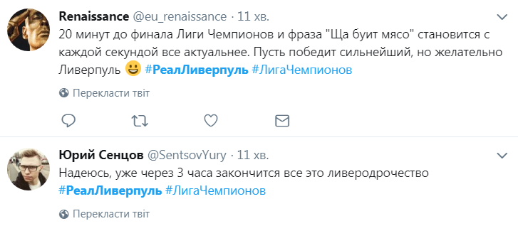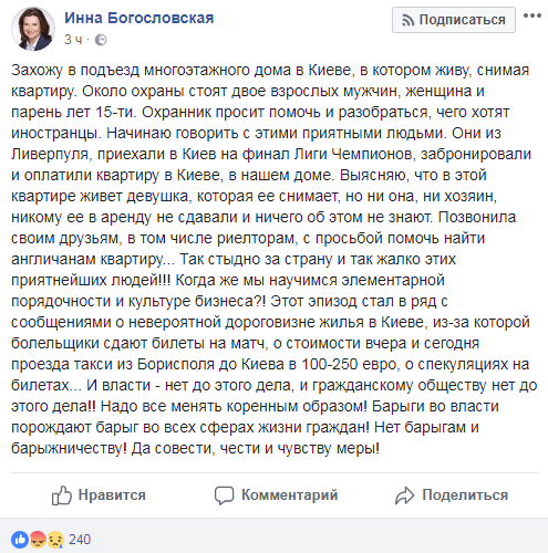 20:53 "Захожу в подъезд многоэтажного дома в Киеве, в котором живу, снимая квартиру. Около охраны стоят двое взрослых мужчин, женщина и парень лет 15-ти. Охранник просит помочь и разобраться, чего хотят иностранцы. Начинаю говорить с этими приятными людьми. Они из Ливерпуля, приехали в Киев на финал Лиги чемпионов, забронировали и оплатили квартиру в Киеве, в нашем доме.