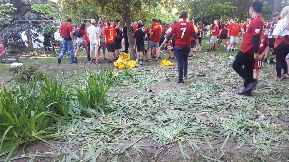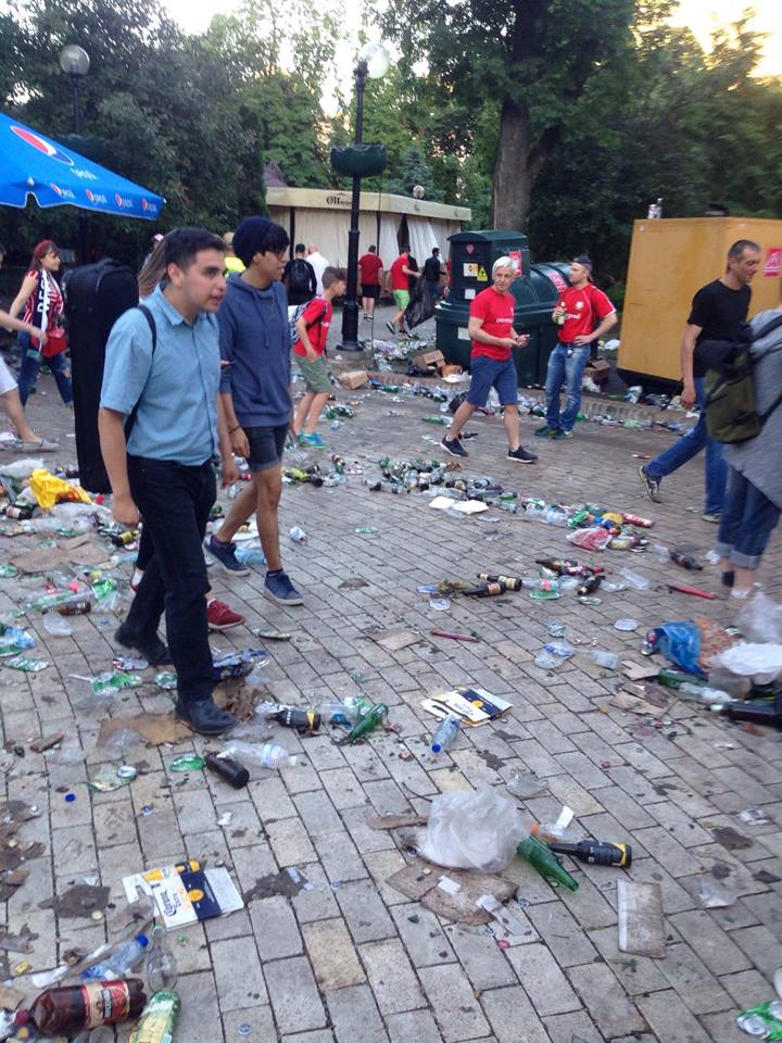 19:40 В фан-зонах Киева – столпотворение. Причем не всегда фанаты ведут себя адекватно. Вот, например, последствия пребывания болельщиков "Ливерпуля" в парке Шевченко.