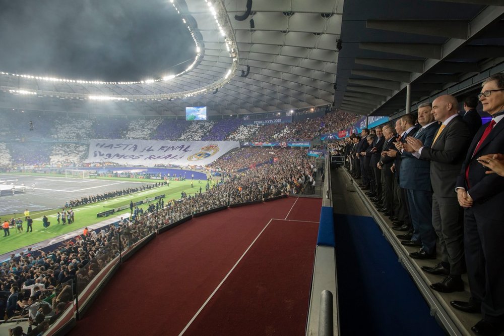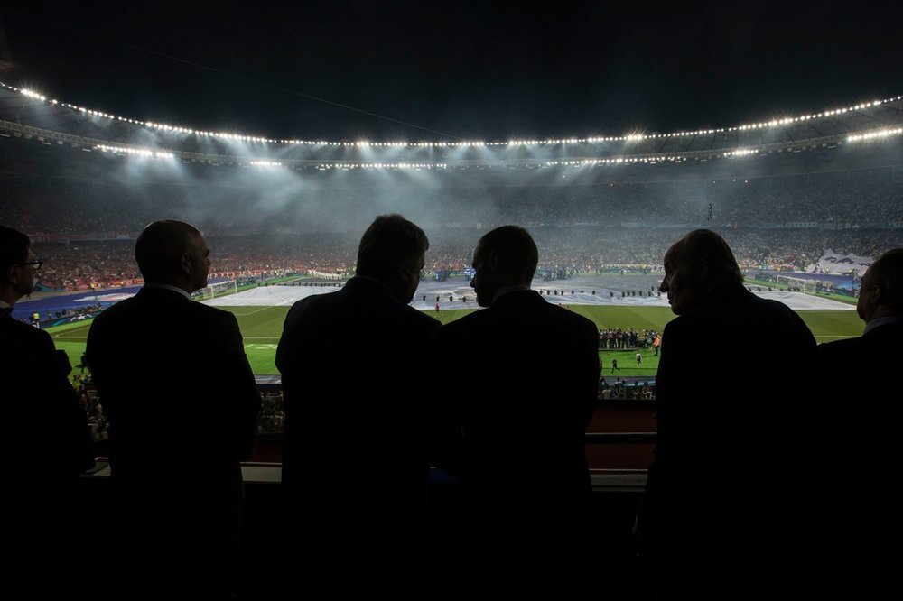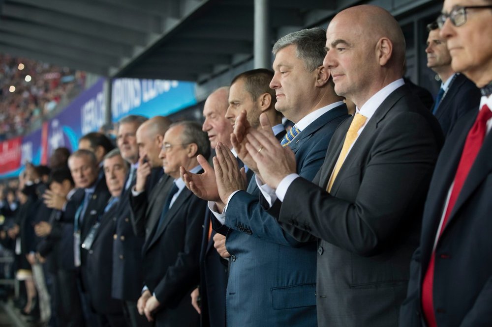 Сегодня, 26 мая, президент Украины Петр Порошенко наблюдает за финальным матчем "Ливерпуля" и "Реала" Лиги чемпионов УЕФА из VIP-ложи на НСК "Олимпийский" в Киеве. Вместе с ним находится король Испании Хуан Карлос І, президент УЕФА Александер Чеферин, президент Эстонии Керсти Кальюлайд и премьер Болгарии Бойко Борисов.