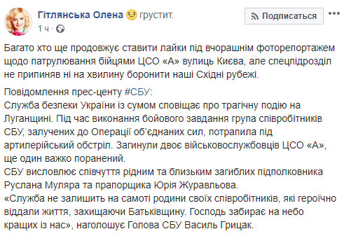Гитлянская отметила, что погибли подполковник Руслан Муляр и прапорщик Юрий Журавлев.
