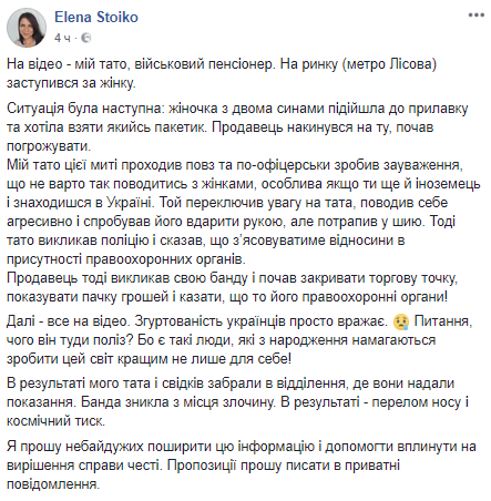 "Ситуация была следующая: женщина с двумя сыновьями подошла к прилавку и хотела взять какой-то пакетик. Продавец набросился на нее, начал угрожать. Мой папа проходил мимо и по-офицерски сделал замечание, что не стоит так обращаться с женщинами, особенно, если ты еще и иностранец и находишься в Украине. Тот переключил внимание на папу, вел себя агрессивно и попытался его ударить рукой, но попал в шею", – пишет Стойко о начале конфликта.
