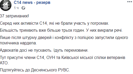 В радикальной организации С14 заявили, что полиция задержала гораздо больше радикалов – 37 человек. При этом лидер группировки Евгений Карась говорит, что его люди в погроме не участвовали, а приехали как наблюдатели – но тоже попали в отделение.
