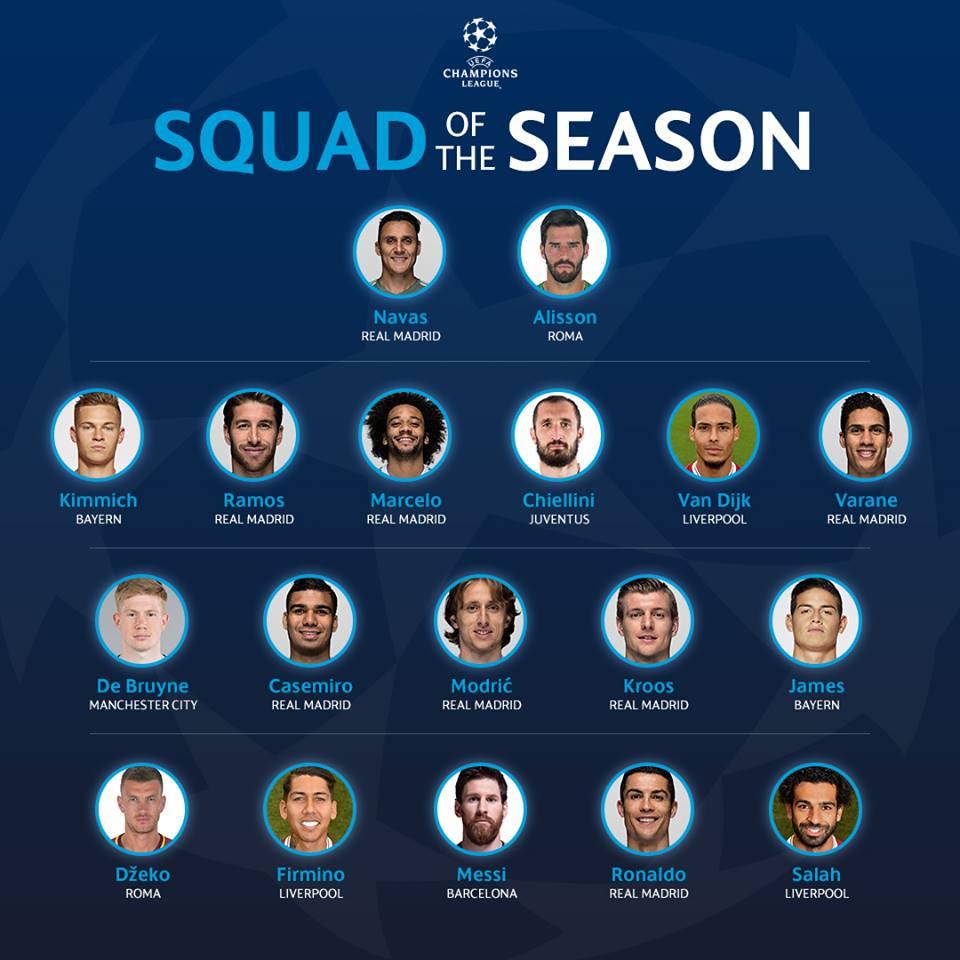 • Защитники: Рафаэль Варан, Марсело, Серхио Рамос (все – "Реал"), Виргил ван Дейк ("Ливерпуль"), Йозуа Киммих ("Бавария"), Джорджо Кьеллини ("Ювентус"). Полузащитники: Каземиро, Тони Кроос, Лука Модрич (все – "Реал"), Кевин де Брюйне ("Манчестер Сити") и Хамес Родригес ("Бавария").