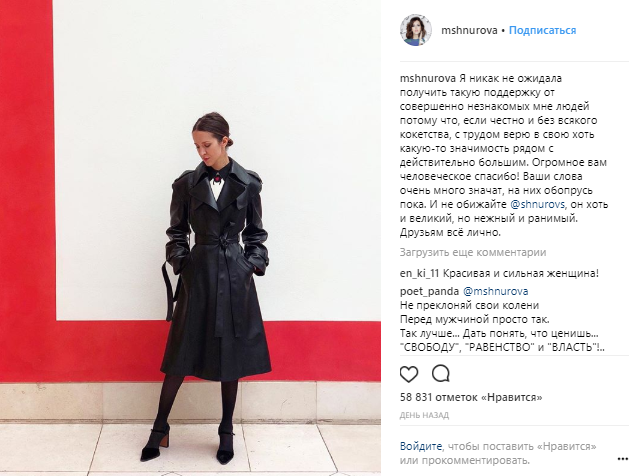 "Я никак не ожидала получить такую поддержку от совершенно незнакомых мне людей, потому что, если честно и без всякого кокетства, с трудом верю в свою хоть какую-то значимость рядом с действительно большим. Огромное вам человеческое спасибо! Ваши слова очень много значат, на них обопрусь пока. И не обижайте Сергея, он хоть и великий, но нежный и ранимый", - написала Матильда Шнурова на своей странице в Инстаграм.