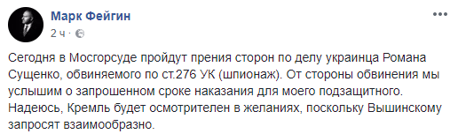 "Сегодня в Мосгорсуде пройдут прения сторон по делу украинца Романа Сущенко, обвиняемого по ст.276 УК (шпионаж). От стороны обвинения мы услышим о запрошенном сроке наказания для моего подзащитного. Надеюсь, Кремль будет осмотрителен в желаниях, поскольку Вышинскому запросят взаимообразно", - написал в соцсети Фейгин.