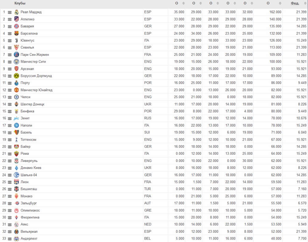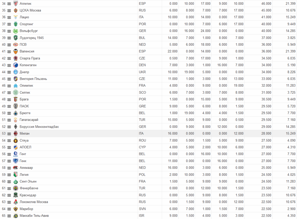 Лучшие 65 клубов Европы по рейтингу УЕФА