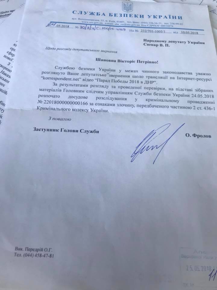 "Служба безопасности Украины в рамках действующего законодательства внимательно рассмотрела Ваше депутатское обращение в вопросе трансляции на Интернет-ресурсе "korrespondent.net" видео "Парад Победі 2018 в ДНР".