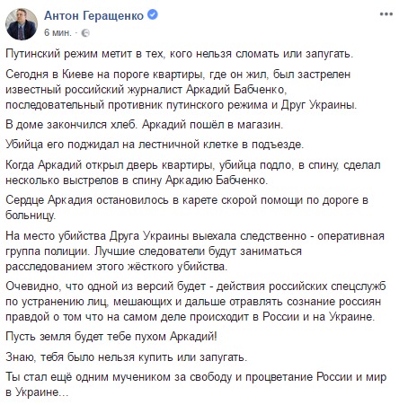 "На место убийства Друга Украины выехала следственно - оперативная группа полиции. Лучшие следователи будут заниматься расследованием этого жёсткого убийства. Очевидно, что одной из версий будет - действия российских спецслужб по устранению лиц, мешающих и дальше отравлять сознание россиян правдой о том что на самом деле происходит в России и на Украине. Пусть земля будет тебе пухом Аркадий! Знаю, тебя было нельзя купить или запугать. Ты стал ещё одним мучеником за свободу и процветание России и мир в Украине..." - заключил Геращенко.