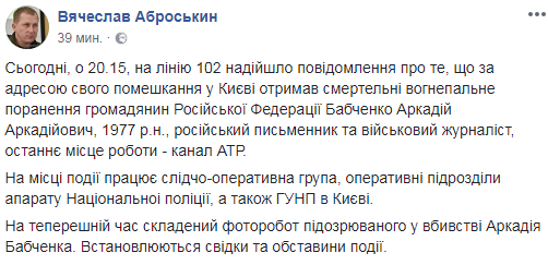 "В настоящее время составлен фоторобот подозреваемого в убийстве Аркадия Бабченко. Устанавливаются свидетели и обстоятельства происшествия", – написал полицейский.